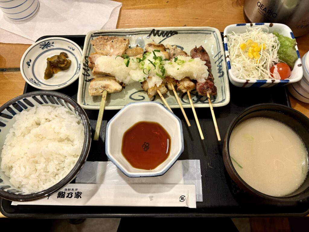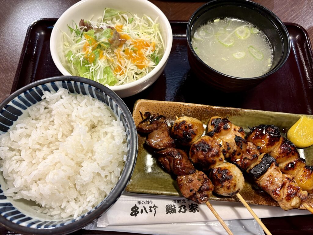 僕の一番のお気に入りメニューです。レバー・つくね・ねぎま・もも、定番の串4種類がセットとなった定食!