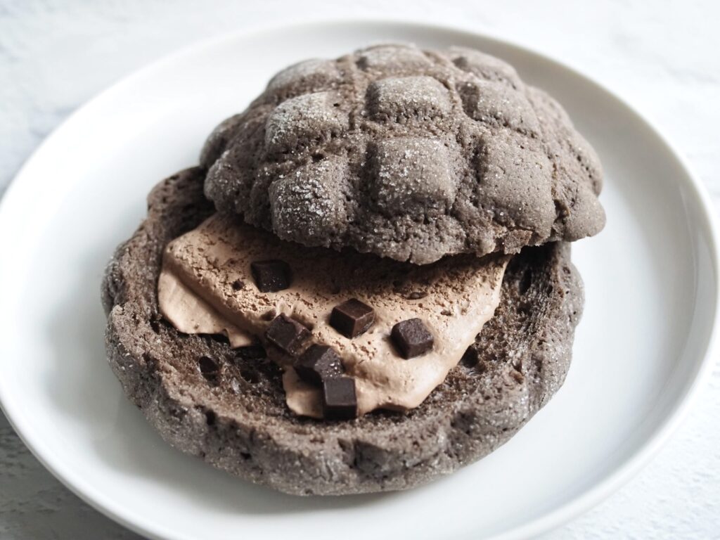 「チョコ風味ビスケット×チョコホイップ×角切りチョコ」の三拍子がそろった、濃厚ながらもくどくないチョコメロンパンでした。