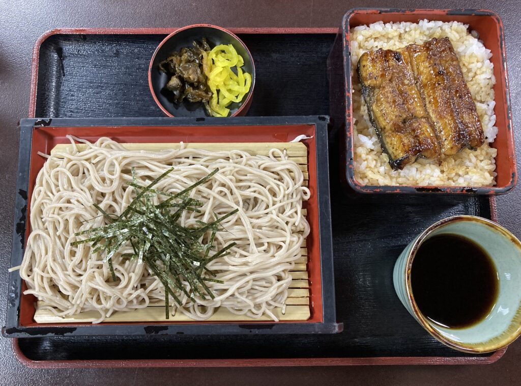 うなぎは、ふかふかとした柔らかな質感。表面に香ばしさもあり、タレとご飯の相性も良好。手打ちの蕎麦はコシと香りがよく、味わい深いセットです。