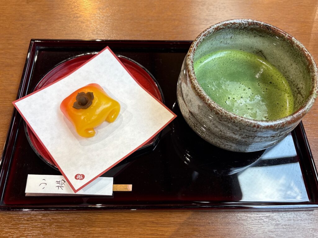 抹茶と季節のお菓子を楽しみながら、参拝・食事後の心と身体をゆるめる時間を過ごしました。甘いもの好きならセットで訪れるのもおすすめです。