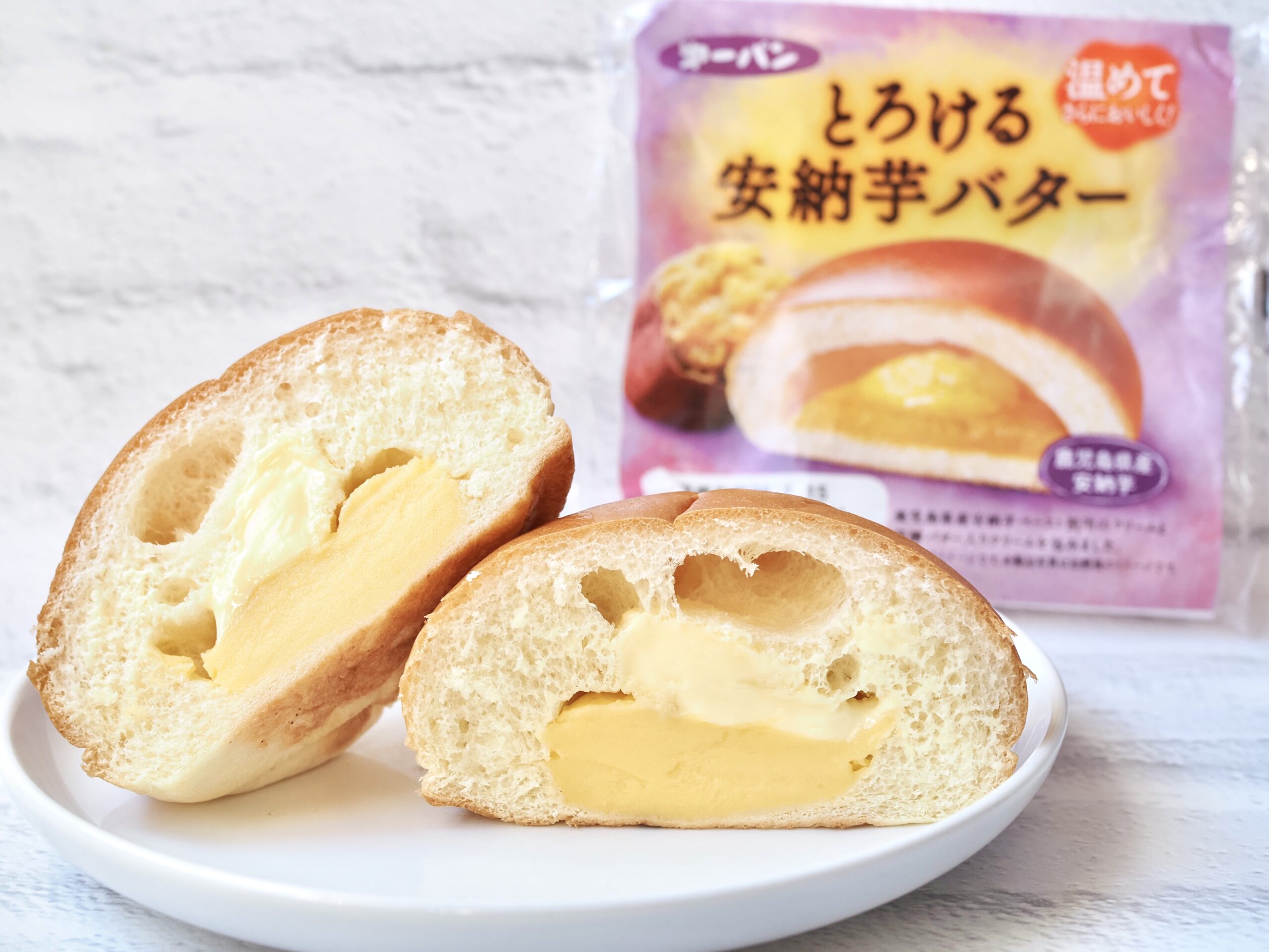 第一パンの「とろける安納芋バター」は、鹿児島県産安納芋ペースト入りクリームと発酵バター入りクリームを包んだ、冬にぴったりの菓子パンだよ。
