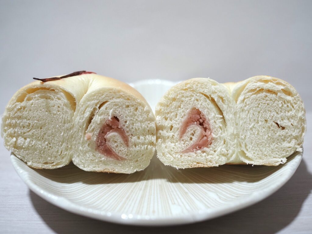 白っぽい生地で、焼きの香ばしさは控えめ。どちらかというと蒸したようなしっとり感が特徴的です。